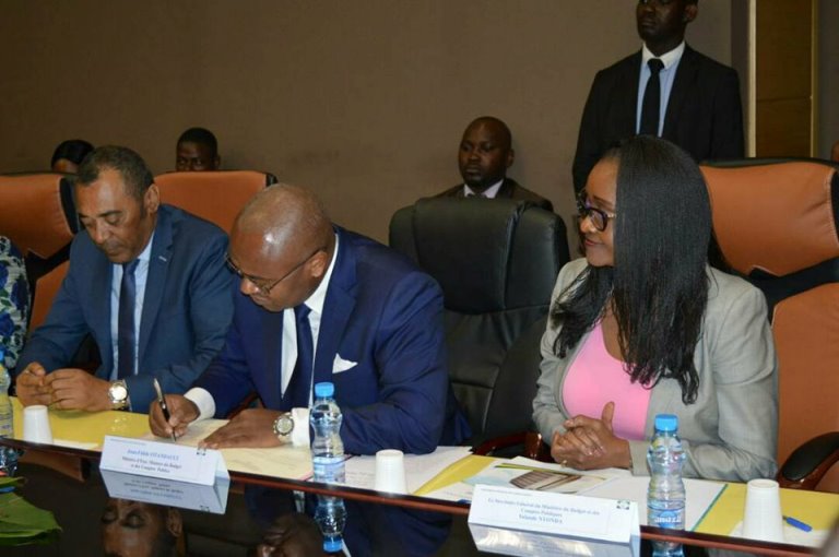 Le ministre du budget échangeant les documents au terme de la séance de signature de convention de règlement de la dette de la SEEG @ E.M. K