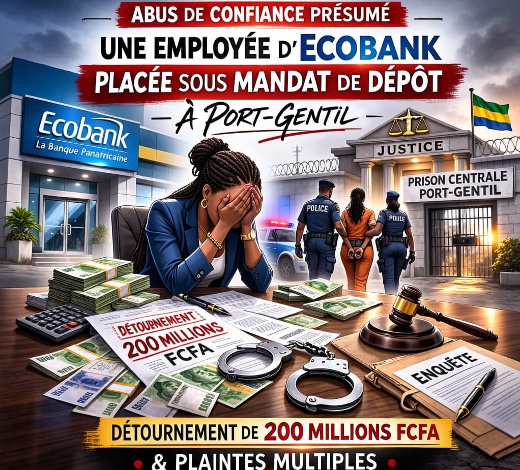 Ida Raïssa Mayana Moussavou, employée à Ecobank Port-Gentil, a été placée sous mandat de dépôt par le Parquet de la République près le Tribunal de première instance de l’Ogooué-Maritime (littoral sud). Elle est poursuivie pour des faits présumés d’abus de confiance au préjudice de son employeur.