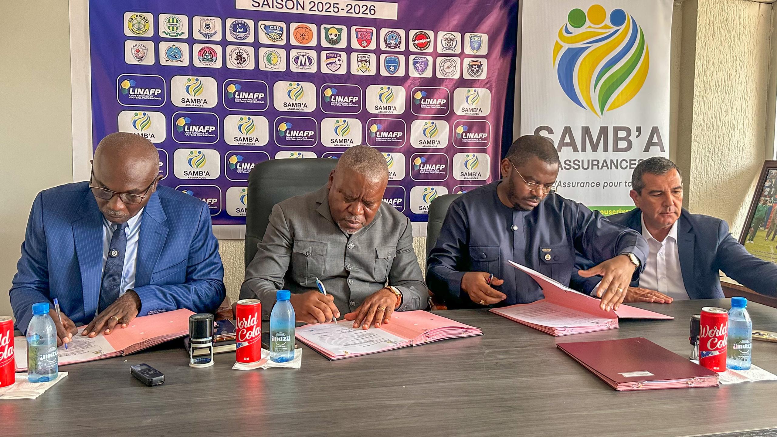 Cette signature faite au siège de la LINAFP sis au centre-ville, s’est déroulée en présence de Brice Mbika Ndjambou, président de la LINAFP, du Dr. Andrew Gwodog, Président Directeur général de Samb’a assurances, ainsi que de Landry Nkeyi, Président de l’association des clubs professionnels de football (ACPF).
